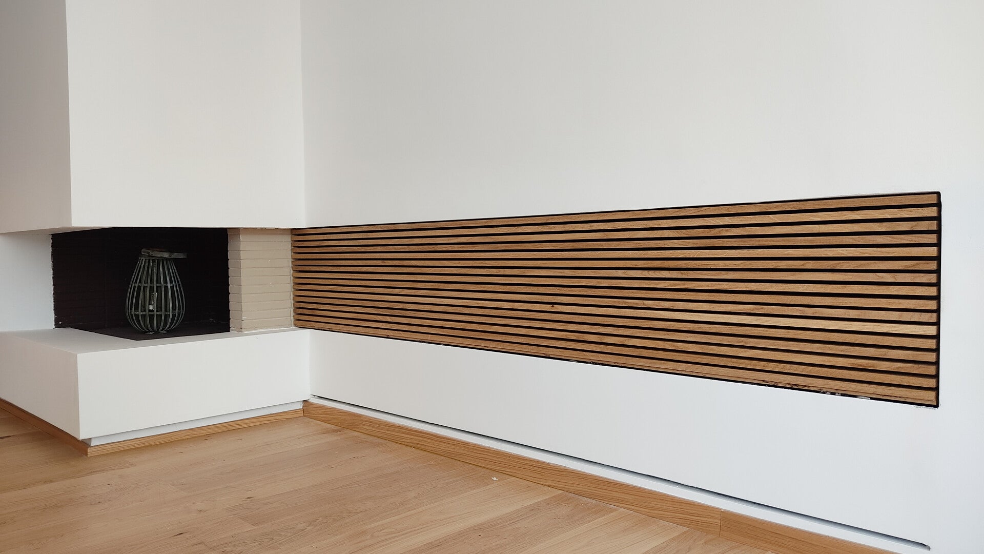 Επένδυση θερμαντικού σώματος με ξύλο δρυός πάνω σε ανοιγώμενο μεταλλικό σκελετό.