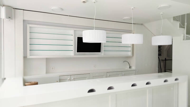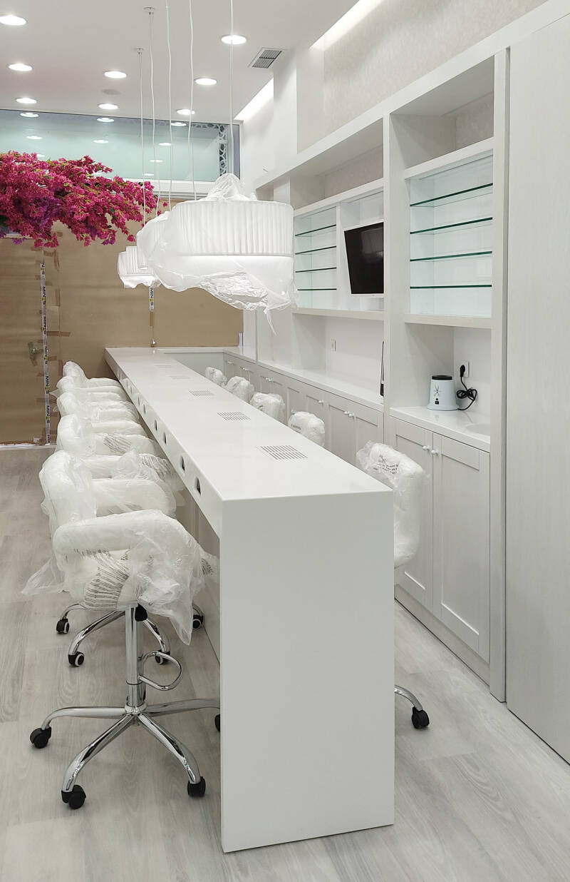 Σύνθετη κατασκευή από MDF, Corian, Καπλαμά δρυός, κρύσταλλα σε ράφια, ντουλάπια και πάγκο εξυπηρέτησης.